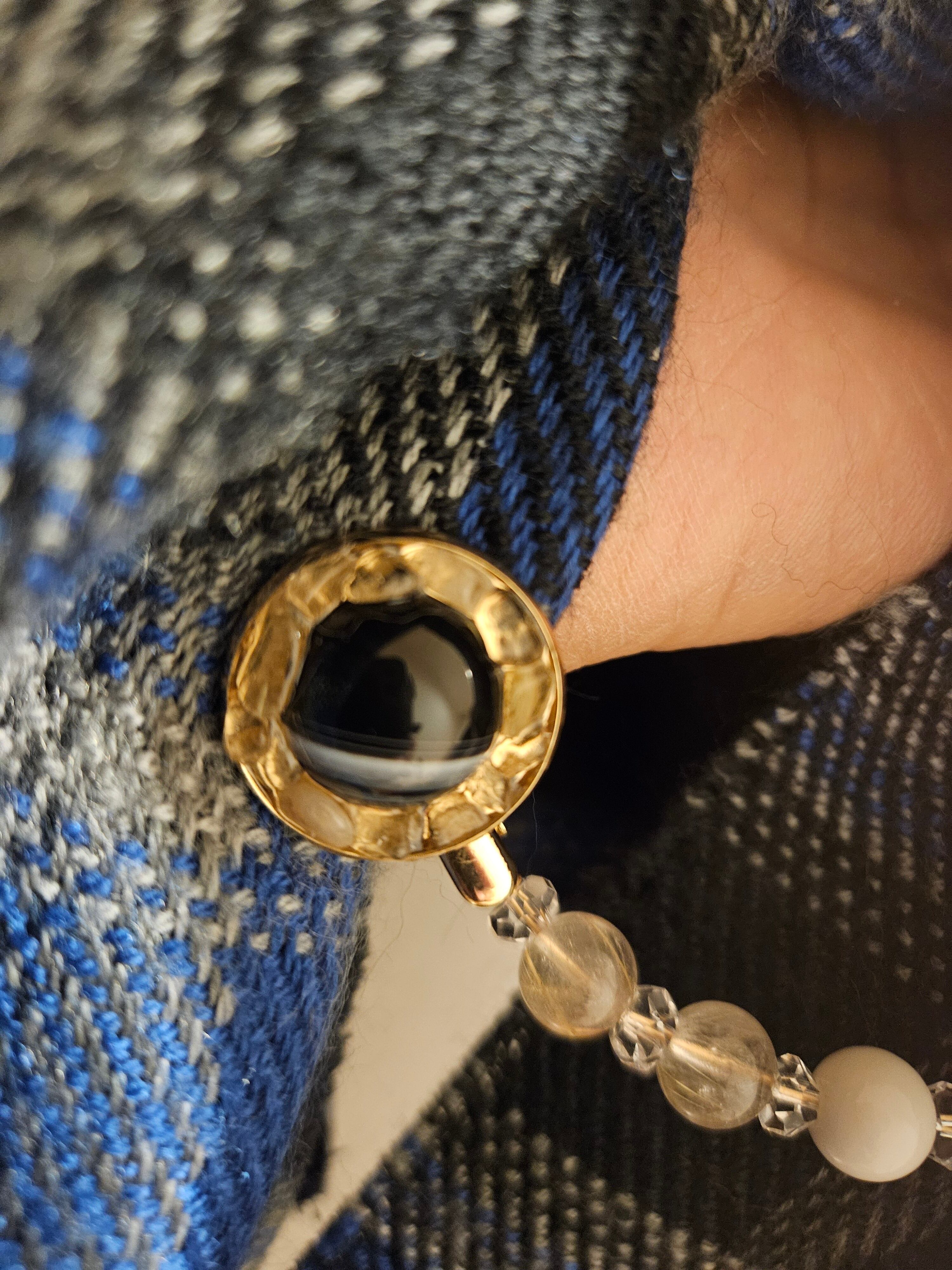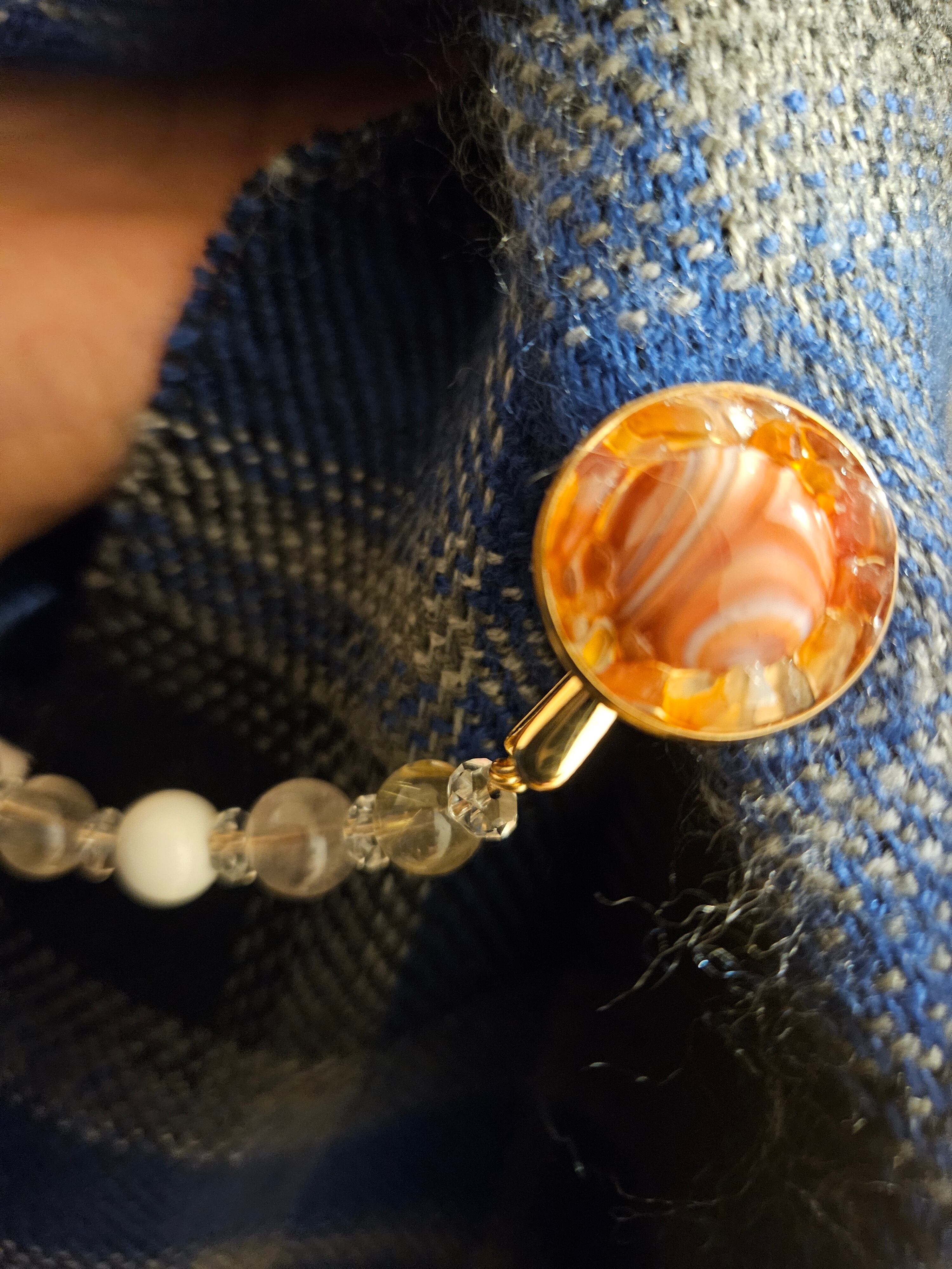 このストールクリップは、運気をアップさせ、金運を呼び寄せる力を秘めた天然石を使用しています。ルチルクォーツの持つエネルギーは、ポジティブな思考や希望を与え、メノウは感情の安定とチャンスを引き寄せ、オニキスは強力な守護石としてお守りの役割を果たします。